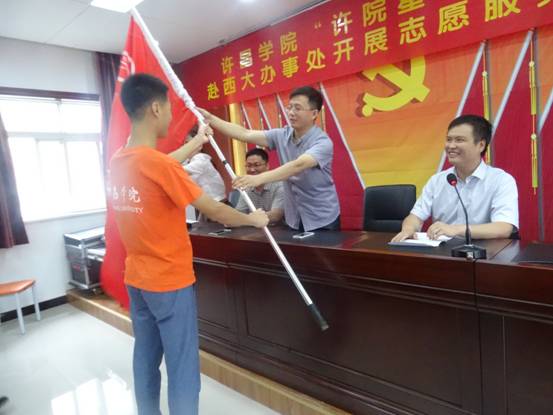 最后,魏都区委组织部副部长贾小明为志愿服务队授旗,并鼓励同学们切实履行实践职责、扎实完成交办的各项任务,祝愿本次志愿服务活动能够圆满完成。至此,启动仪式圆满结束,实践工作正式开始。